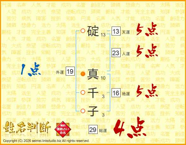 あなたの人生を表す1番重要な運勢です。生涯を通じて影響する総合運となり、主に50歳以降の晩年期に影響を及ぼします。苗字と名前の合計画数。