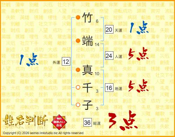 竹(6画)端(14画) 真(10画)千(3画)子(3画)