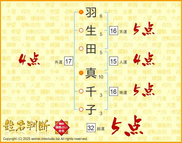 羽(6画)生(5画)田(5画) 真(10画)千(3画)子(3画)