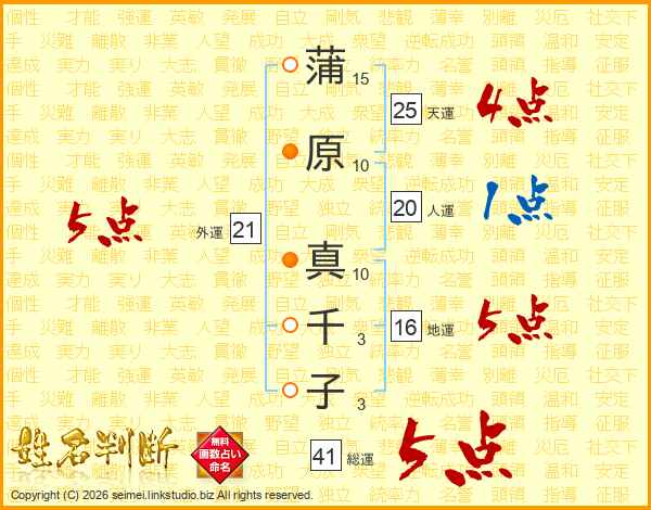 蒲(15画)原(10画) 真(10画)千(3画)子(3画)