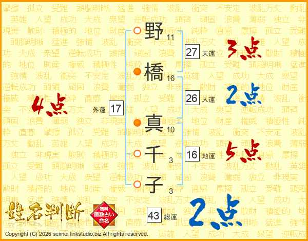 野(11画)橋(16画) 真(10画)千(3画)子(3画)