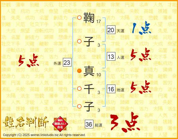 鞠(17画)子(3画) 真(10画)千(3画)子(3画)