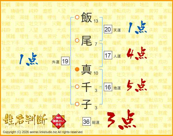 飯(13画)尾(7画) 真(10画)千(3画)子(3画)