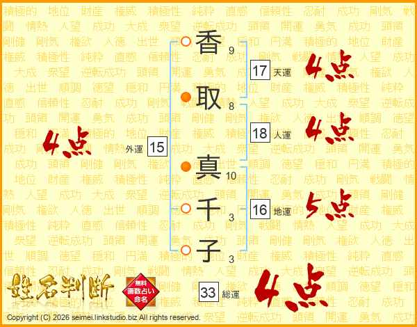 香(9画)取(8画) 真(10画)千(3画)子(3画)
