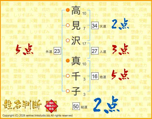 高見沢真千子さんの総運は50画の2点!