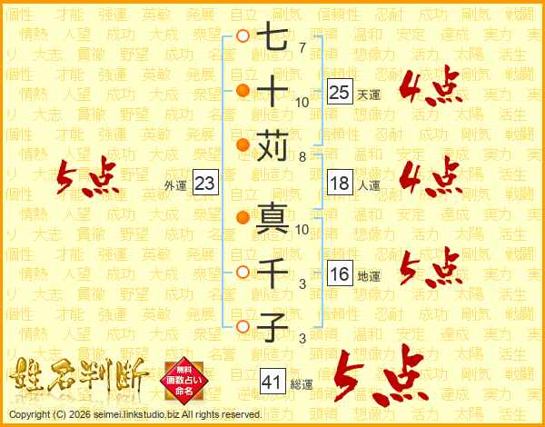 七(7画)十(10画)苅(8画) 真(10画)千(3画)子(3画)