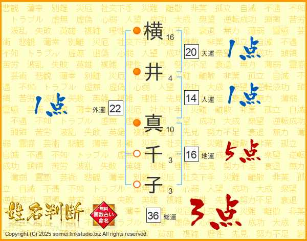 横(16画)井(4画) 真(10画)千(3画)子(3画)