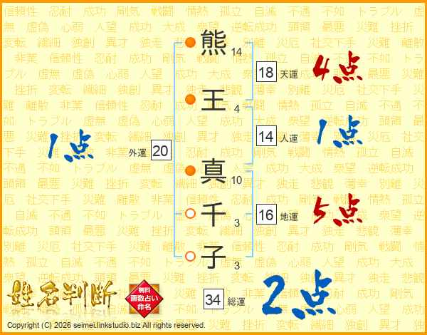 熊(14画)王(4画) 真(10画)千(3画)子(3画)