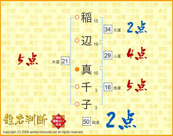 稲(15画)辺(19画) 真(10画)千(3画)子(3画)