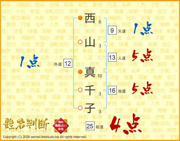 西(6画)山(3画) 真(10画)千(3画)子(3画)