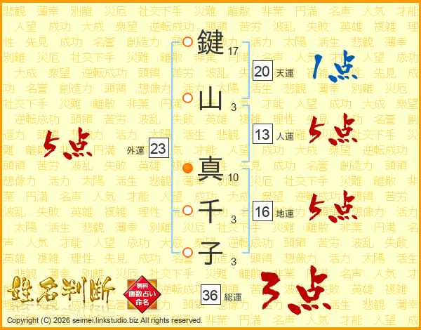 鍵(17画)山(3画) 真(10画)千(3画)子(3画)