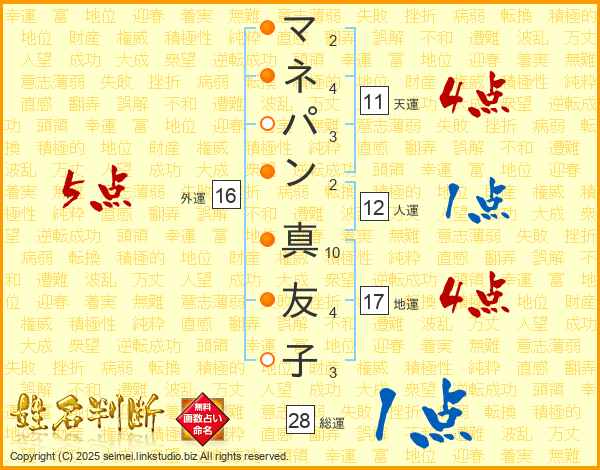 マ(2画)ネ(4画)パ(3画)ン(2画) 真(10画)友(4画)子(3画)