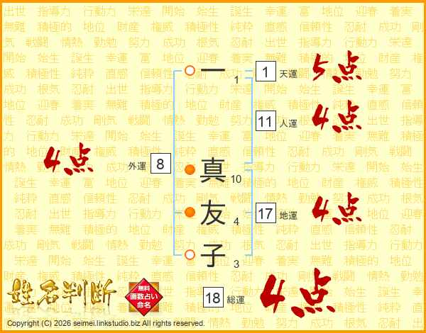 生活面を象徴する運勢です。外部から受ける影響力を表し、結婚運、家庭運や職場、環境への順応性を表します。総運から人運を引いた画数。姓や名が1文字の場合を除く。
