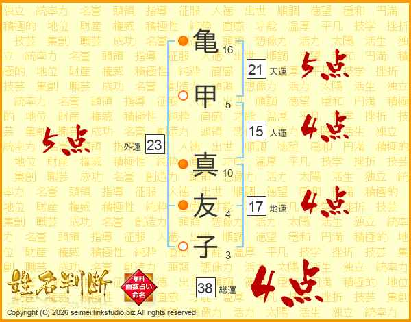 亀(16画)甲(5画) 真(10画)友(4画)子(3画)
