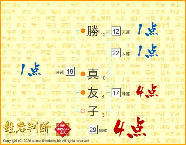 勝(12画) 真(10画)友(4画)子(3画)