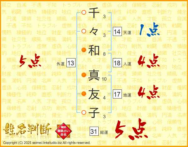 千(3画)々(3画)和(8画) 真(10画)友(4画)子(3画)
