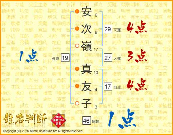安(6画)次(6画)嶺(17画) 真(10画)友(4画)子(3画)