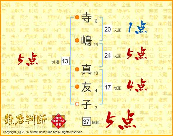 寺(6画)嶋(14画) 真(10画)友(4画)子(3画)