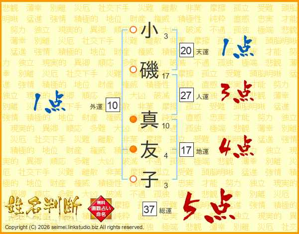 小(3画)磯(17画) 真(10画)友(4画)子(3画)