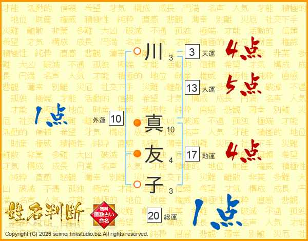 川(3画) 真(10画)友(4画)子(3画)