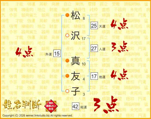 松(8画)沢(17画) 真(10画)友(4画)子(3画)