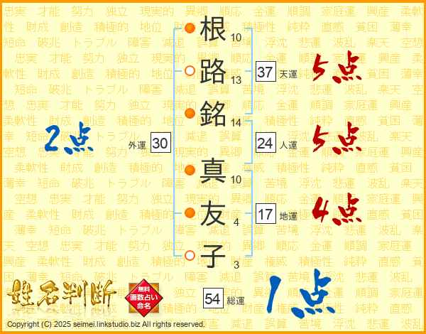 根(10画)路(13画)銘(14画) 真(10画)友(4画)子(3画)