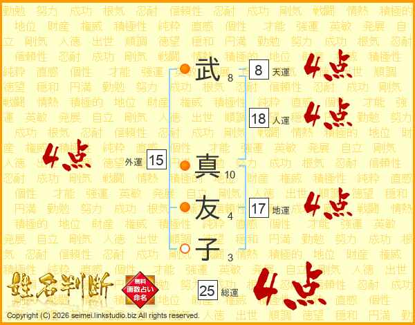 武(8画) 真(10画)友(4画)子(3画)