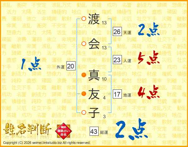 渡(13画)会(13画) 真(10画)友(4画)子(3画)