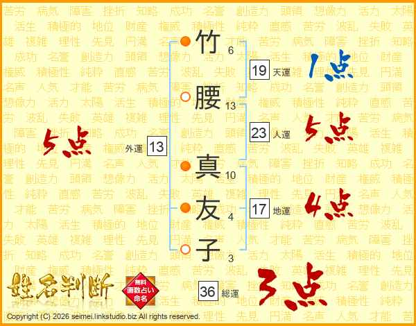 竹(6画)腰(13画) 真(10画)友(4画)子(3画)