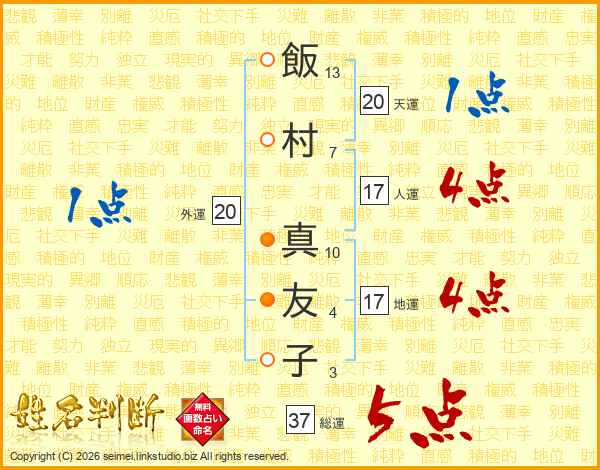 飯(13画)村(7画) 真(10画)友(4画)子(3画)