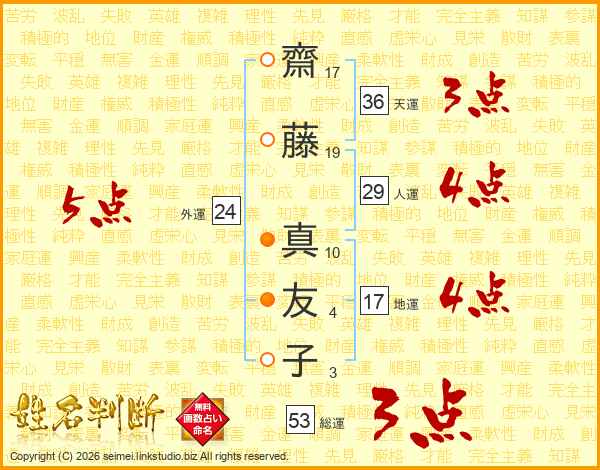 齋(17画)藤(19画) 真(10画)友(4画)子(3画)