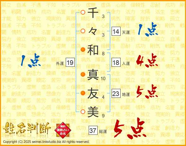 千(3画)々(3画)和(8画) 真(10画)友(4画)美(9画)