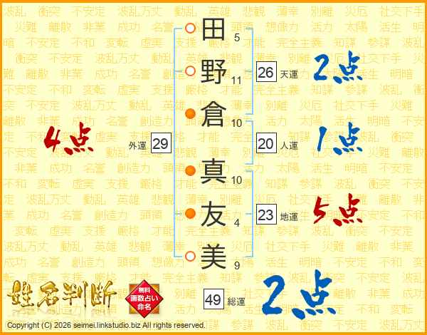 田(5画)野(11画)倉(10画) 真(10画)友(4画)美(9画)