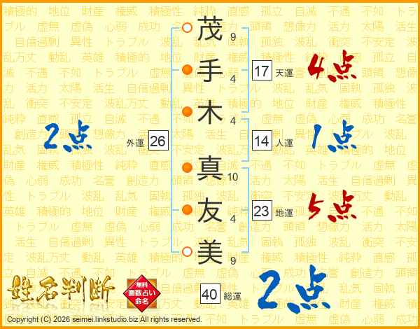 茂(9画)手(4画)木(4画) 真(10画)友(4画)美(9画)