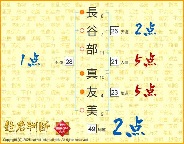長(8画)谷(7画)部(11画) 真(10画)友(4画)美(9画)