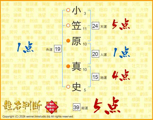 小笠原真史さんの総運は39画の5点!