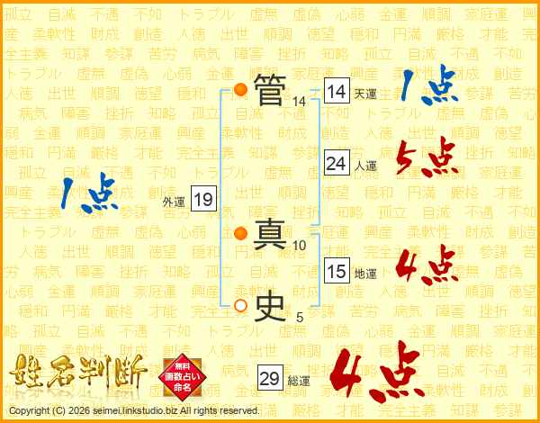 生活面を象徴する運勢です。外部から受ける影響力を表し、結婚運、家庭運や職場、環境への順応性を表します。総運から人運を引いた画数。姓や名が1文字の場合を除く。
