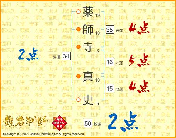 薬(19画)師(10画)寺(6画) 真(10画)史(5画)