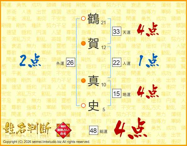 鶴(21画)賀(12画) 真(10画)史(5画)