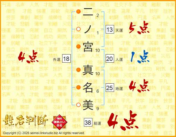 二(2画)ノ(1画)宮(10画) 真(10画)名(6画)美(9画)