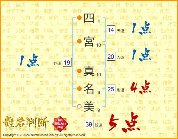 四宮真名美さんの総運は39画の5点!