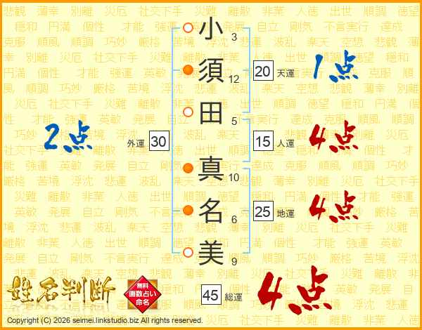 小(3画)須(12画)田(5画) 真(10画)名(6画)美(9画)