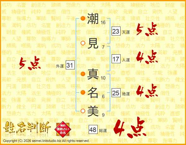 潮(16画)見(7画) 真(10画)名(6画)美(9画)