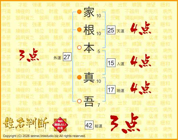 家(10画)根(10画)本(5画) 真(10画)吾(7画)