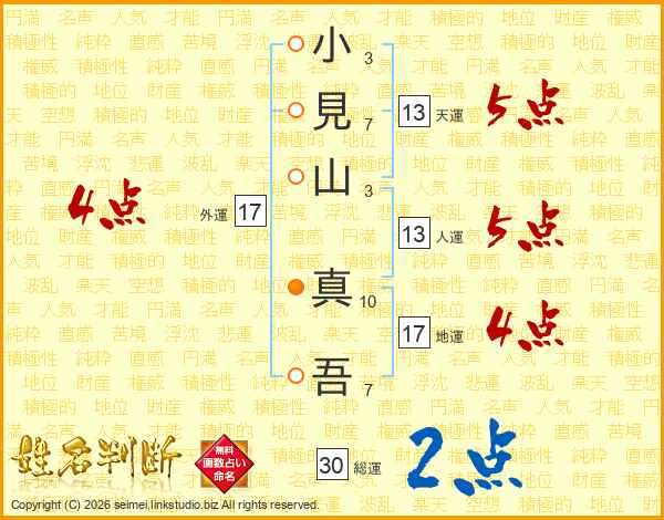 小(3画)見(7画)山(3画) 真(10画)吾(7画)