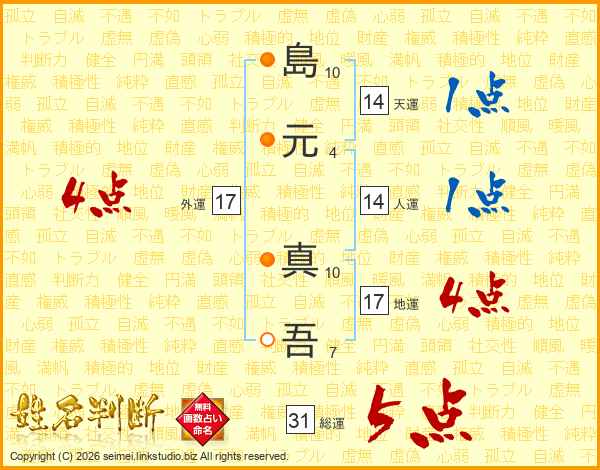 島(10画)元(4画) 真(10画)吾(7画)