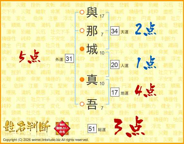 與(17画)那(7画)城(10画) 真(10画)吾(7画)