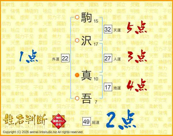 駒(15画)沢(17画) 真(10画)吾(7画)