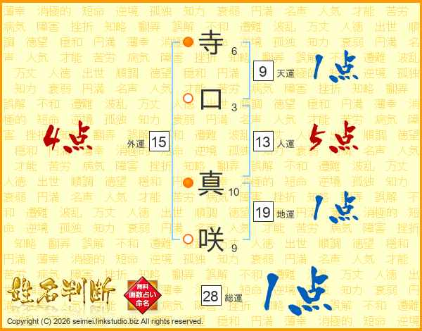 寺(6画)口(3画) 真(10画)咲(9画)