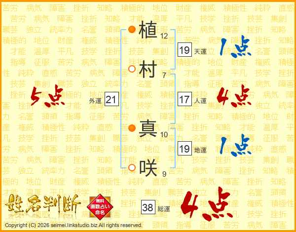生活面を象徴する運勢です。外部から受ける影響力を表し、結婚運、家庭運や職場、環境への順応性を表します。総運から人運を引いた画数。姓や名が1文字の場合を除く。